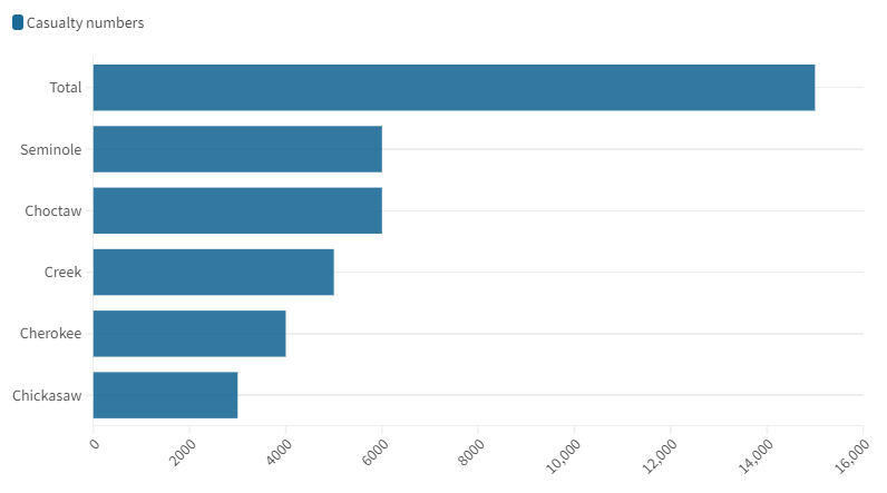 I noticeably made two flourish data collections but only submitted one. The first data collection included the causes of death for the casualties on the Trail of Tears. Among the causes of death were starvation, typhus and even cholera. I also tried to look for the precise numbers of deaths among each of the five peoples. From what I found initially the Cherokee had 1,500 deaths, however I looked at a few more articles from communityliteracy.com and narrowed it down to 6,000 estimated deaths. I also had some notable trouble with finding exact numbers on the Creek and Seminole at first. However, I was soon able to find number estimates of around 5,000 for the Creek. As for the Seminole, I couldn’t find exact numbers for the Trail of Tears itself but about 6,000 died during the Seminole Wars. The total number of casualties along the Trail of Tears was around 15,000.